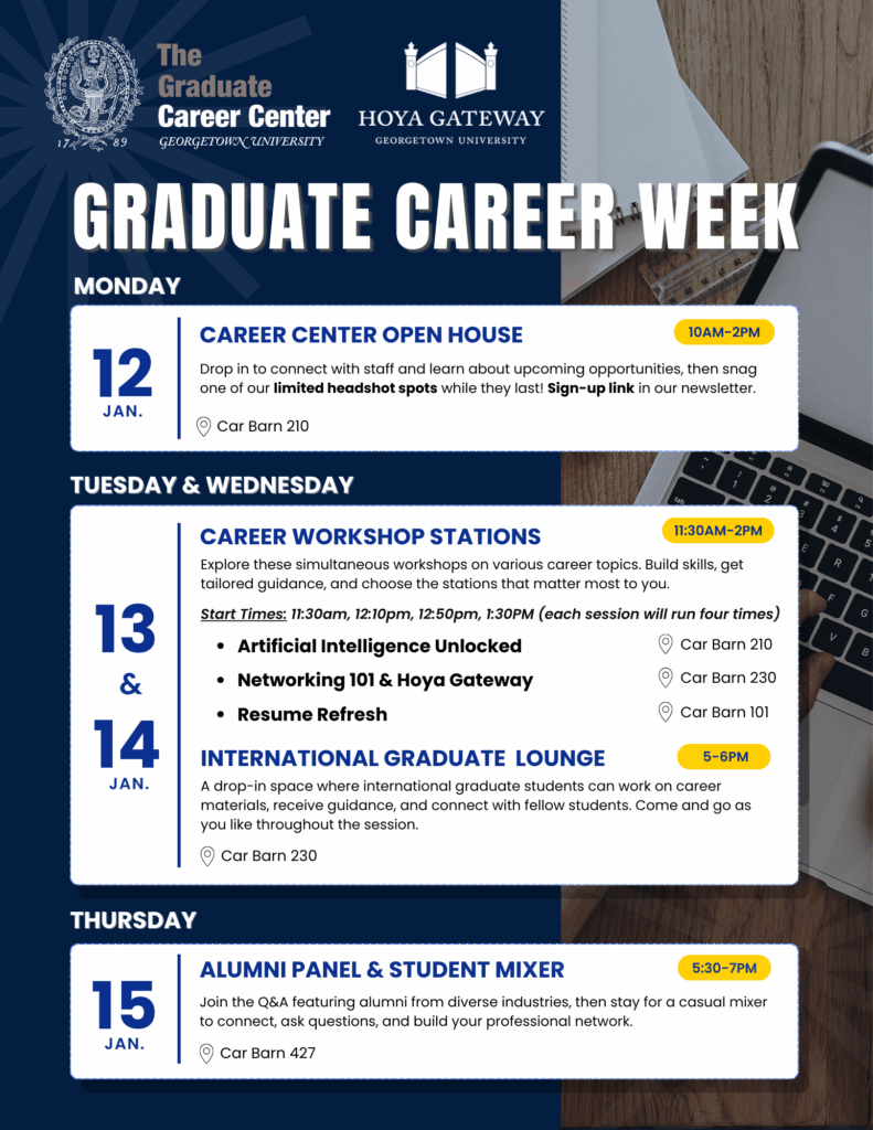Not sure what your next career step looks like? Spring Graduate Career Week brings together a variety of workshops, panels, and networking events to help graduate students explore options, sharpen skills, and make meaningful professional connections. Join us for a week of actionable guidance, honest conversations, and resources designed specifically for graduate-level career planning. Stay up-to-date by tuning into our biweekly newsletters and following us on LinkedIn.